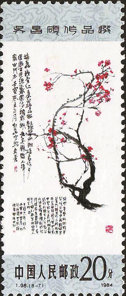 1929年,梅花曾被中华民国国民政府确定为国花。孙中山先生是中国革命先驱,被国人尊称为“国父”。中华民国邮政曾发行一套梅花环绕孙中山的邮票,国花托国父,可谓情深意长。1980年,我国邮政部门发行了T44《齐白石作品选》系列邮票一套,共16枚。其中第7枚为“红梅”,画面以狭长的中国画条屏形式,展现了梅花迎寒风而怒放的风姿。这是新中国第一枚以梅花为主图的邮票。1982年,为了庆祝中日邦交正常化十周年,我国邮政部门发行了J84《中日邦交正常化十周年》纪念邮票一套2枚。其中第1枚邮票主图是关山月的写意梅花,图中梅花雄姿英发,不畏严寒,其铮铮铁骨意寓中华民族的民族气节。我国现有梅花品种300余种,现尚存有隋、唐、宋之梅,树龄长达千余年。1985年,我国邮政部门发行了T103《梅花》特种邮票,共6枚邮票和1枚小型张。6枚邮票分别为“绿萼”“垂枝”“龙游”“朱砂”“洒金”“杏梅”,小型张图为“台阁”“凝馨”,这8种最具代表性的梅花品种,是梅花专家陈俊愉教授从我国众多梅花品种中选出来的。这是新中国邮票中目前为止惟一一套梅花专题邮票。