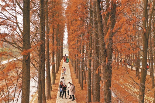 | 1月2日,衡阳市雁峰区岳屏镇隆桥村,游客在水杉林里游玩。当天,人们走出家门,走进市郊的自然景点,乐享如画美景。 曹正平 周仲辉 摄影报道 |