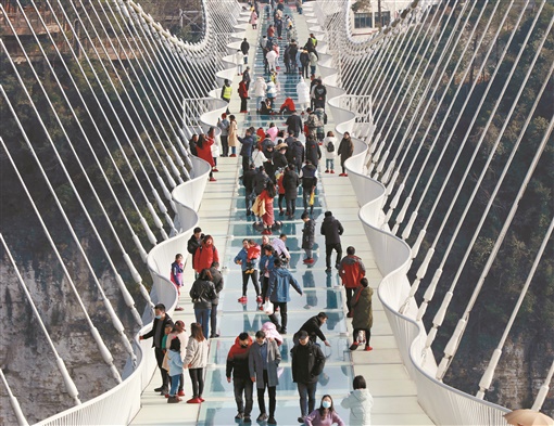 | 1月2日,游人在张家界大峡谷景区高空玻璃桥上参观,体验“凌空漫步、如履薄冰”的惊险与刺激,乐享快乐假期。吴勇兵 罗克文 摄影报道 |
