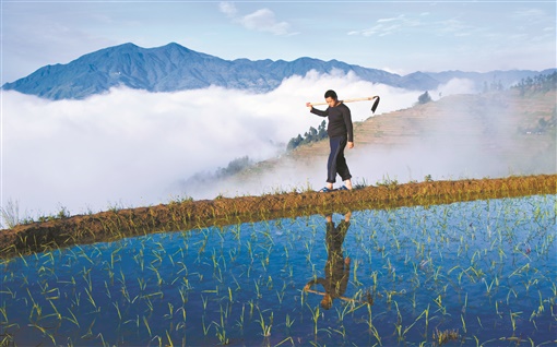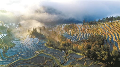 东方既白,太阳升起。金色阳光照进梯田、板屋、森林、清泉、群山、沟壑,云层涌动,金海翻波。罗中山的镜头,追逐着梦一般的紫鹊界梯田云海。