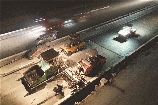 1月6日晚,道县207国道绕城路施工工地,工人在铺设沥青路面。近期,该项目的施工人员不畏严寒,加班加点保进度,确保春节前能够通车。绕城路通车后,将打通县内多条断头路,大大缓解县城内的车辆拥堵。何红福 摄