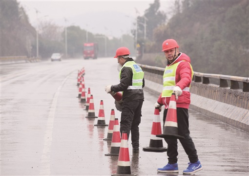 1月7日,嘉禾县桂嘉公路五百洞大桥段,路政工作人员在摆放警示牌,确保道路畅通和交通安全。