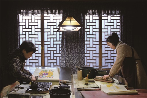 1月8日,隆回县滩头镇福美祥年画作坊,滩头木版年画省级传承人尹冬香(左)和女儿肖扬在印制滩头年画。春节临近,在“现代民间年画之乡”的滩头镇,年画艺人们忙着印制木版年画,以供应节日市场。曾勇 摄
