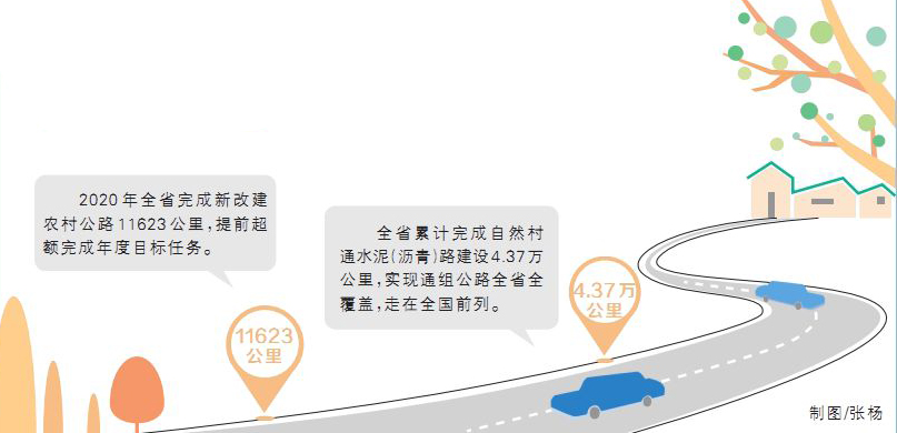 在“十三五”收官之年,全省累计完成自然村通水泥(沥青)路建设4.37万公里,实现通组公路全省全覆盖,走在了全国前列。