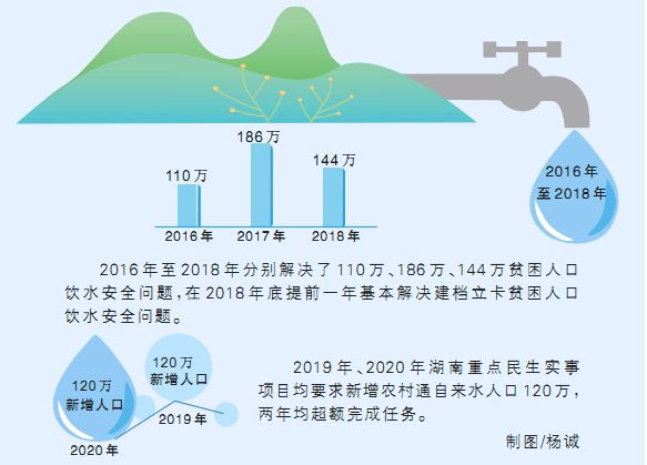 巩固和新增农村自来水人口120万人,是我省2020年的重点民生实事之一。2020年3月,省水利厅印发实施意见,将120万人的任务指标分解落实到14个市州的108个项目县(市、区),明确了目标任务,建立了责任体系。各地科学谋划项目,积极筹措资金,快速推进项目实施。