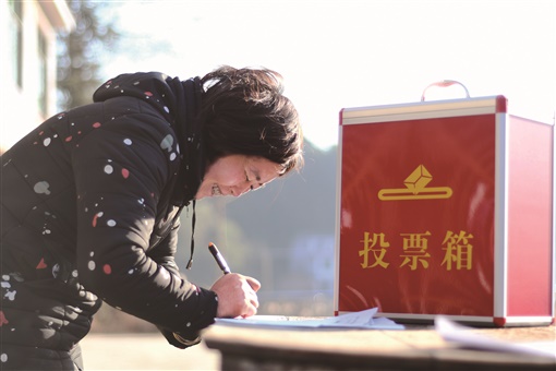 1月12日,双峰县井字镇增峰村,村民在认真填写村委会成员候选人提名票。近日,该县村“两委”换届选举工作全面展开,选民依法公正参选,选出村里信任的“当家人”。李建新 摄