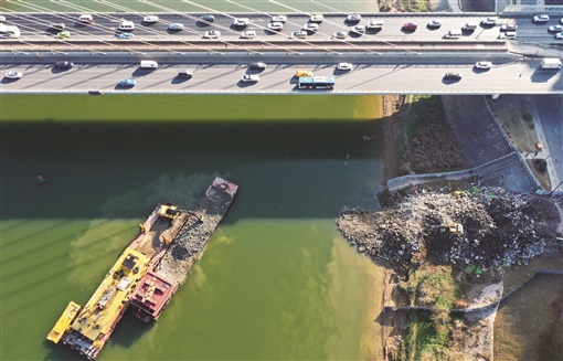 1月14日,浏阳河长沙段,施工机械在河中工作平台上打捞已爆破拆除的洪山庙老桥桥体碎块。该桥于10日晚爆破后,河道清理施工随即展开。水下渣土总量约6000立方米,预计还需要10天左右全部清理完毕,恢复河道畅通。湖南日报·新湖南客户端记者 田超 摄