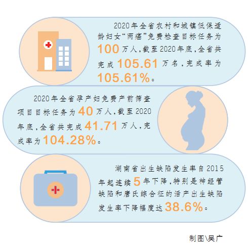 花“小”钱,防“大”病。记者从省卫生健康委获悉,湖南连续多年实施妇女“两癌”免费检查和孕产妇免费产前筛查民生实事项目,为妇女健康保驾护航。其中,2020年共为105.61万名农村和城镇低保适龄妇女免费提供宫颈癌和乳腺癌检查服务,完成率105.61%;2020年共为41.71万名孕产妇免费提供产前筛查服务,完成率104.28%。