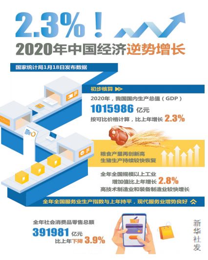 GDP破百万亿元!国家统计局18日出炉的2020中国经济年报,不仅见证中国经济发展迈上新台阶,也在极不平凡年份下交出一份高含金量的靓丽答卷。