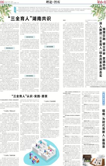 湖南自2019年入选全国“三全育人”综合改革试点区以来,形成了可复制的经验,打造了湖南样板,本次论坛发布的《“三全育人”湖南共识》,为推动“三全育人”综合改革发出了湖南声音、贡献了湖南方案。根据部党组有关部署,为进一步将“三全育人”综合改革引向深入,提出如下建议:
