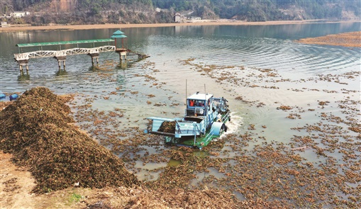 1月20日,衡东县甘溪水轮泵水电站,工作人员驾驶水上垃圾打捞船清理水葫芦。近年,该县对辖区水域的水葫芦等漂浮植物进行定期清理,确保水域清洁与河道畅通,保护水生态环境。