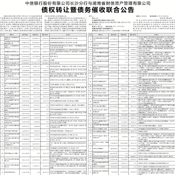 中信银行股份有限公司长沙分行与湖南省财信资产管理有限公司 债权转让暨债务催收联合公告
