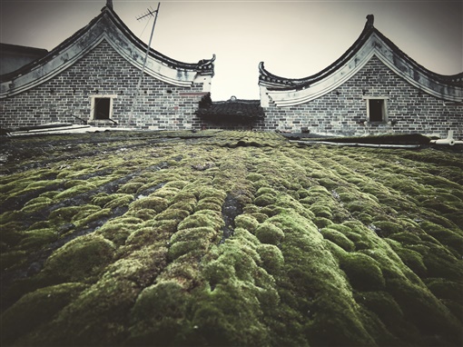 黑褐色的飞檐上,蹲着一只大鸟,衬以青砖,老墙,灰瓦,以及瓦当上斑驳的青苔,不正是一幅水墨画么?