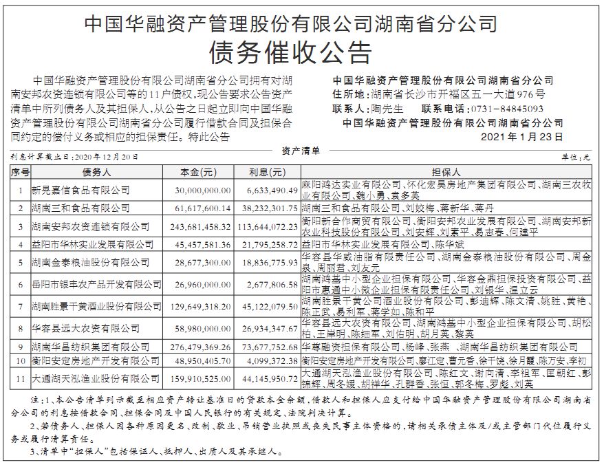 中国华融资产管理股份有限公司湖南省分公司 债务催收公告