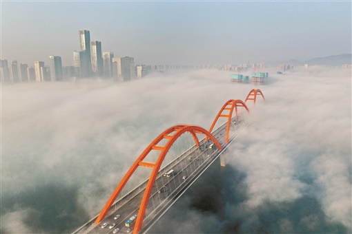 1月29日清晨,长沙市湘江两岸云雾缭绕,高楼在雾中若隐若现,恍如仙境,整个城市仿佛成了“天空之城”。当天,长沙市气象台发布大雾橙色预警信号。