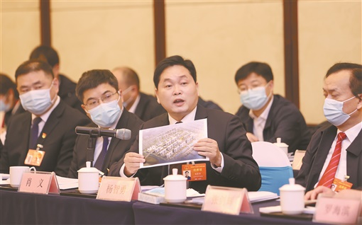 | 1月27日,益阳代表团分组审议时,杨智勇代表(左三)展示渔民安置点的效果图,介绍沅江市推动洞庭湖3个洲岛村渔民上岸的举措和成效,建议加大力度助力退捕渔民转产转业。湖南日报·新湖南客户端记者 赵持 摄 |