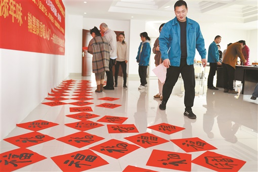 临近春节,浙江省湖州市吴兴区推出一系列暖心举措,倡导外来务工人员“就地过年”,并组织党员干部和志愿者访园区、进企业,向外来务工人员赠送春节礼物,派发旅游消费券等福利,在异乡营造温馨的节日氛围。图为1月29日,在华祥(中国)高纤有限公司,外来务工人员在挑选八里店镇志愿者书写的福字。新华社发
