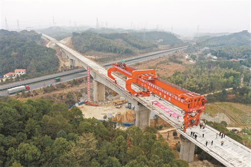 1月31日下午,常益长铁路跨岳临高速特大桥箱梁架设现场,随着最后一榀重达790吨的箱梁安装固定,该桥箱梁架设全部完成,标志着常益长铁路项目六标段(全线铺轨施工的起点标段)十六座桥梁圆满完成箱梁架设,全面转入线上施工。该标段也成为常益长铁路全线首家完成箱梁架设的标段。