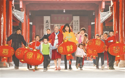 1月31日,道县乐福堂乡龙村,文化志愿者与村民一起挂灯笼。春节临近,当地文化志愿者走进龙村,为村民挂灯笼、贴春联,张灯结彩,大红灯笼挂满村里的每条古巷,古村年味十足。