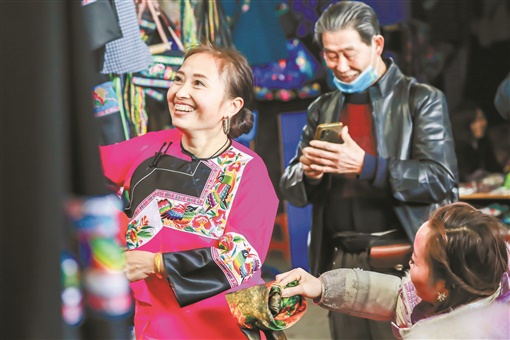1月31日,吉首市乾州农贸市场,苗族同胞在选购苗族服饰。春节将近,年味渐浓,当地苗家群众纷纷选购自己中意的苗族服装、鞋帽、银饰等传统服饰,喜迎新春佳节。 刘振军 摄