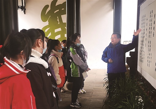 “同学们,你们看,这是一副对联,上面写着‘惟楚有材,于斯为盛’,意思就是说,这里经常出人才,是群英汇集的地方。”讲解员谭雪梅指着书院大门为学生解说。