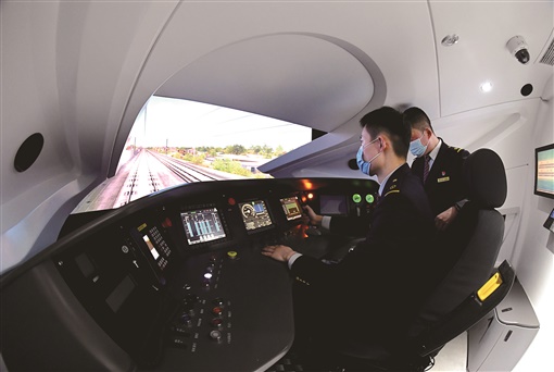 | 中国铁路郑州局集团有限公司郑州机务段依托铁路机车模拟驾驶实训基地,对机车乘务员加强实训演练。图为2月2日,机车乘务员在仿真驾驶舱内进行实训演练。 |