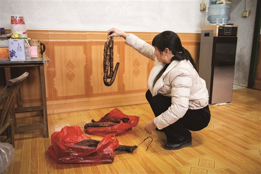 | ▲1月29日,在湖南省泸溪县浦市镇麻溪口村,武中翠给在广州一家医院做护理工作的儿子打包准备寄出的腊肠。 |