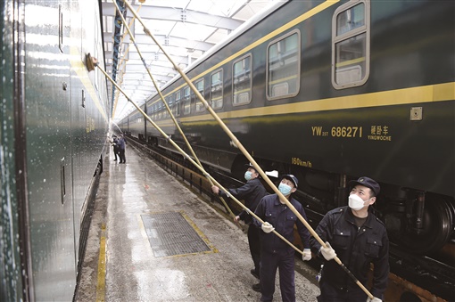 | 2月1日,往返于哈尔滨与广州间的Z237/8次旅客列车来到“火车洗澡堂”接受清洗。这个“火车洗澡堂”是中国铁路哈尔滨局集团有限公司三棵树车辆段的整备库,哈尔滨整备车间的数十名工作人员每天在这里拿着刷子、水管等工具洗刷车体,给列车“洗头搓澡”。图为工作人员为Z237/8次旅客列车洗刷车身。 |