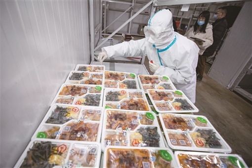 | 春运期间,成都印象川之味餐饮有限公司承担为成都、重庆、贵阳三地的180多对动车组每天提供近万份盒饭的任务。图为2月2日,在成都印象川之味餐饮有限公司的冷链成品库,工作人员在冷链盒饭外包装上提取核酸检测环境样本。 |