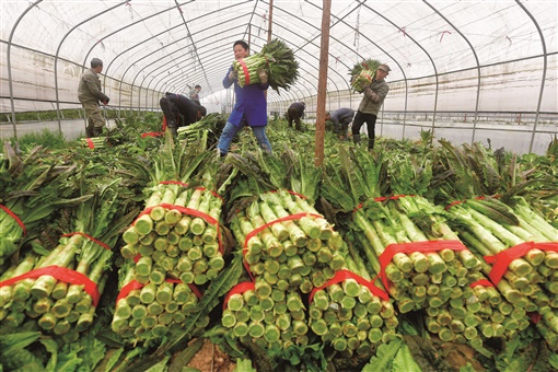 2月3日,汉寿县辰阳街道诚盟蔬菜种植专业合作社基地,村民在采收莴笋。该县是蔬菜生产大县,也是“湖南省放心菜生产基地”,常年复种蔬菜近45万亩,年产量150多万吨,总产值达20亿元。蔬菜主要供应粤港澳大湾区和出口日本、新加坡等国家。