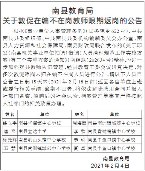 南县教育局关于敦促在编不在岗教师限期返岗的公告