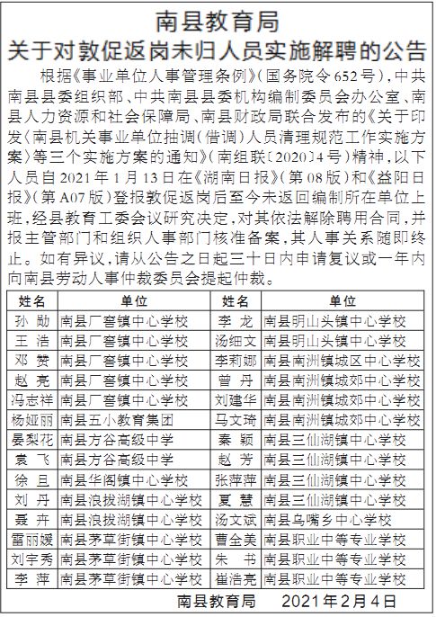 南县教育局关于对敦促返岗未归人员实施解聘的公告