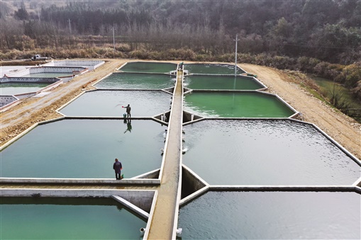2月4日,资兴市三都镇石拱村流水养鱼基地,养殖户在喂鱼。该市实施东江湖禁捕退捕、网箱退水上岸工程后,出台了相关政策,引导养殖户在东江库区以外的乡镇发展岸上工厂化流水养殖,既保护了东江湖的水质,又促进了东江鱼产业的可持续发展和群众增收。朱孝荣 摄