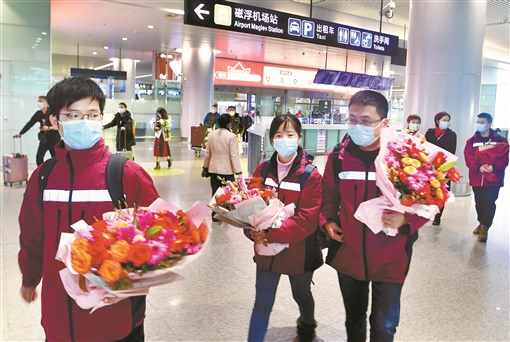 2月8日下午,长沙黄花国际机场,援吉抗疫专家返湘。当天,中南大学湘雅医院支援吉林重症医疗队圆满完成救治任务,5名重症医疗专家乘机平安凯旋。