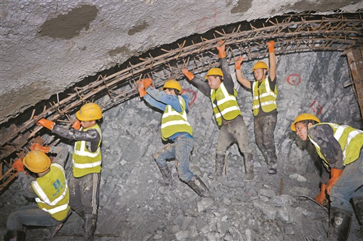 2月8日,长沙地铁6号线湘雅三医院站至六沟垅站暗挖区间项目现场,来自四川的几名工人在进行拱架安装施工。春节临近,由中建五局负责施工的该项目通过发放新年红包、春节慰问物资和筹备年夜饭等措施,让留守岗位的400多名建设者能安心暖心就地过年。 湖南日报·新湖南客户端记者 李健 通讯员 凌志 摄影报道