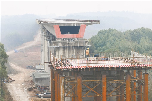半小时后,运输车抵达宁乡站特大桥转体连续梁下。混凝土由天泵送至33米高的桥梁之上,浇筑常益长铁路的一个个片段。
