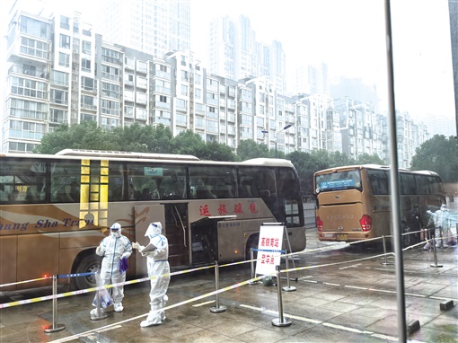 这批客人有些特殊,是从境外乘坐飞机在长沙落地全国各省的人。他们将在长沙集中隔离14天后再返回户籍地,负责接机的正是天心区防控指挥部的工作人员。