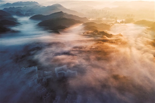2月20日,吉首市乾州街道三岔坪村附近云海涌动,山峰和建筑物在云海中若隐若现,美如画卷。刘振军 摄