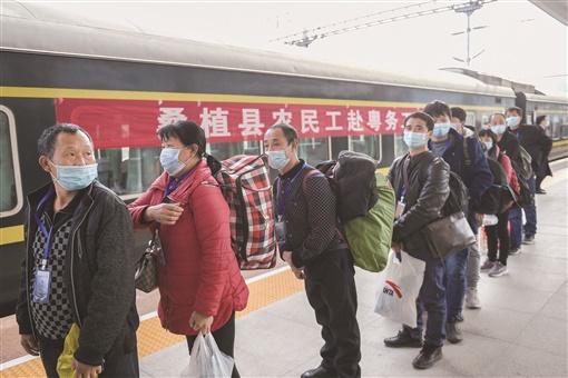 2月20日,外出务工人员排队登上前往深圳的返岗专列。当天,K6591次返岗务工专列满载着635名旅客从桑植站开出,这是节后张家界开行的首趟赴粤返岗专列。