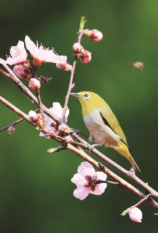 2月21日,衡阳市雁峰区五星村,绣眼鸟在桃花树枝头停歇。连日来,随着气温回升,三湘大地春光明媚,百花盛开,一派鸟语花香、生机盎然的美丽景象。