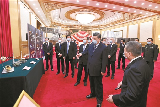 新华社北京2月22日电 中共中央总书记、国家主席、中央军委主席习近平22日上午在北京人民大会堂会见探月工程嫦娥五号任务参研参试人员代表并参观月球样品和探月工程成果展览,充分肯定探月工程特别是嫦娥五号任务取得的成就。他强调,要弘扬探月精神,发挥新型举国体制优势,勇攀科技高峰,服务国家发展大局,一步一个脚印开启星际探测新征程,不断推进中国航天事业创新发展,为人类和平利用太空作出新的更大贡献。