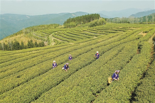 2月22日,双牌县上梧江瑶族乡盘家村云台山生态有机茶园,茶农在采摘春茶。初春时节,该茶园黄金茶进入采摘期,茶农抢抓农时,采摘、加工春茶,供应市场。何红福 摄