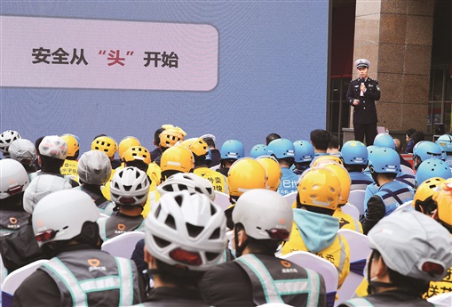 2020年11月6日,长沙交警向电动车骑手代表宣传骑行时佩戴安全头盔的重要性。 湖南日报·新湖南客户端记者 徐行 摄