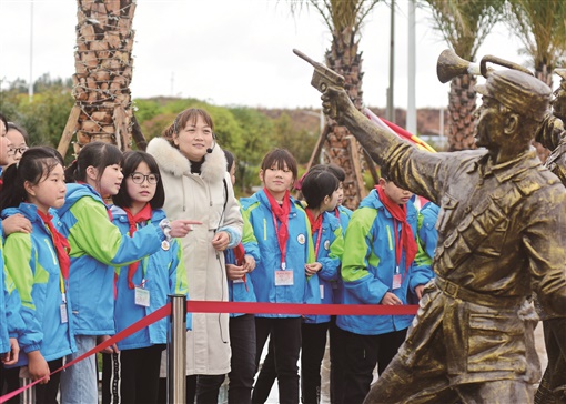 ① 嘉禾县禾仓堡小广场,一鸣学校老师向学生宣讲党的光辉历史。黄春涛 摄