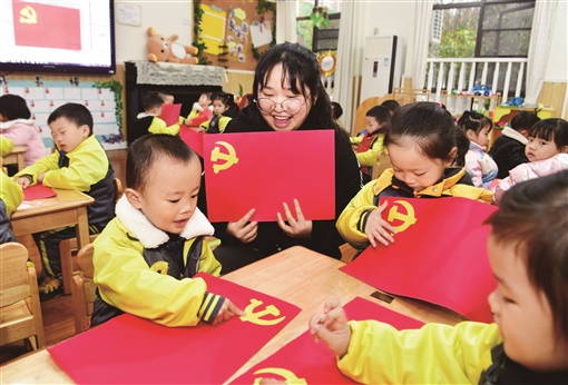 ② 长沙市开福区教育局山语城幼儿园,老师在给小朋友们讲解党旗、党徽的含义。