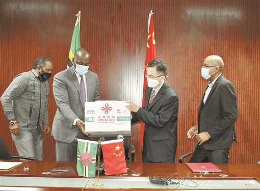中国援助多米尼克新冠疫苗交接仪式4日在多米尼克首都罗索举行。图为3月4日,在多米尼克首都罗索,多米尼克总理斯凯里特(左二)与中国驻多米尼克大使馆临时代办罗松涛(右二)交接物资。新华社发