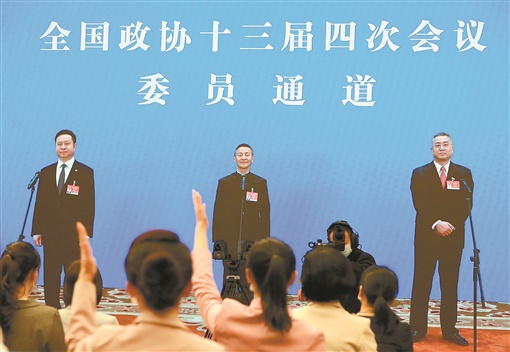 3月7日,全国政协十三届四次会议第二场“委员通道”采访活动在北京人民大会堂新闻发布厅举行。图为记者在分会场屏幕前举手提问。