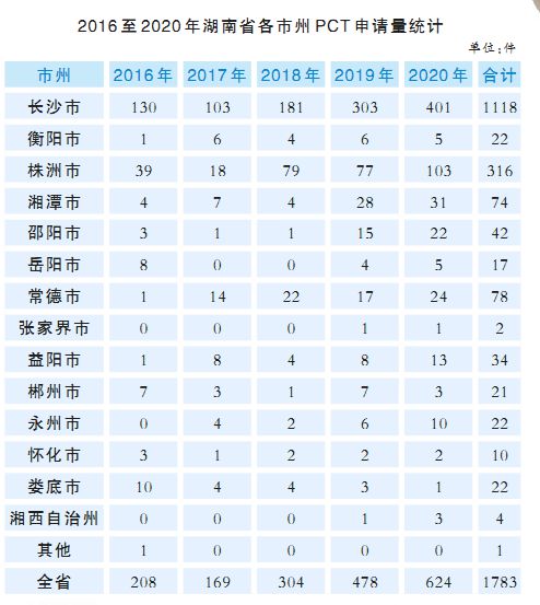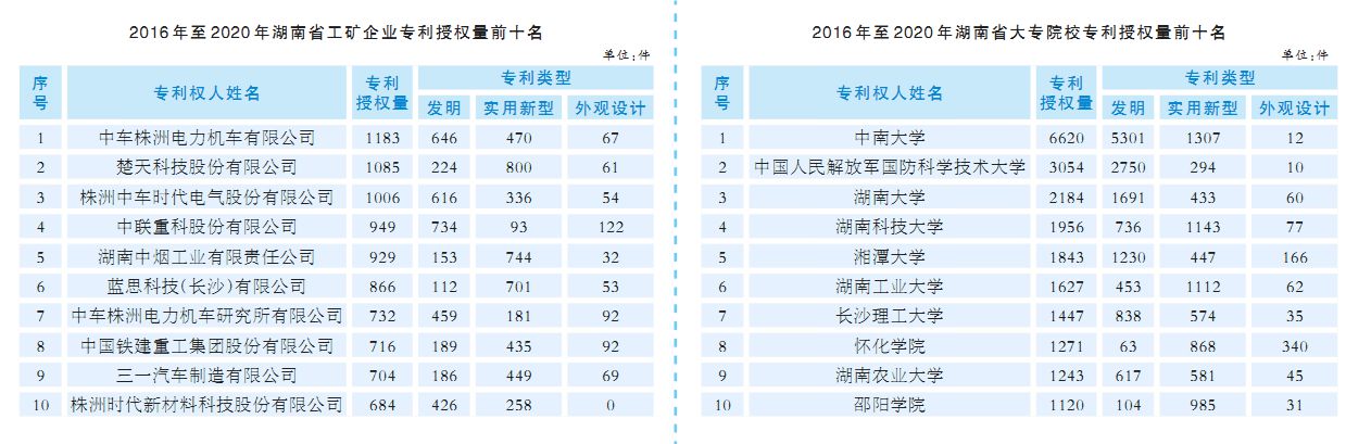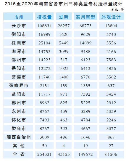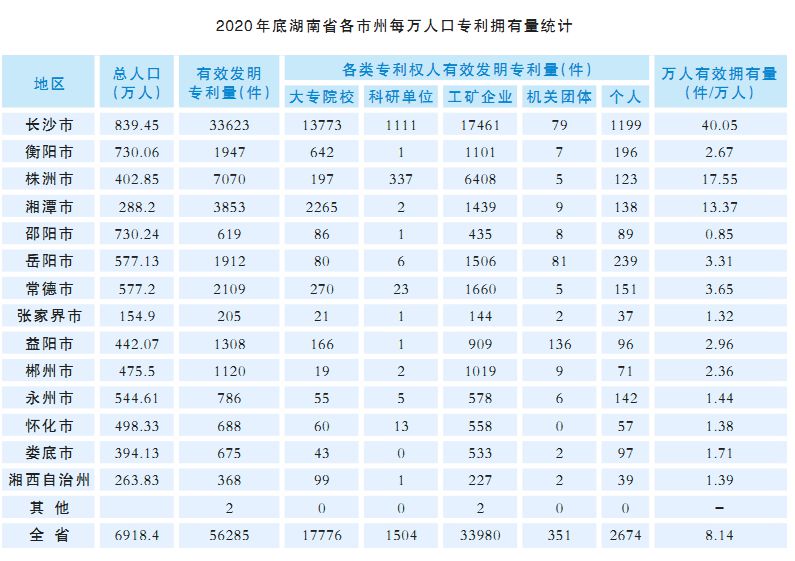 “十三五”以来,湖南知识产权系统坚持以习近平新时代中国特色社会主义思想为指导,在省委、省政府的坚强领导下,坚持“三抓三促”(抓服务,促专利量升质优;抓保护,促营商环境优化;抓运用,促产业创新发展)的工作思路,进一步提升知识产权创造、保护、运用、管理和服务水平。截至2020年12月底,全省发明专利拥有量达56285件,每万人口发明专利拥有量达8.14件,全省5年累计授权专利25.43万件,PCT专利申请(国际专利申请)1783件。
