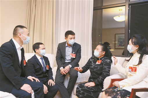 “彬伢子,你真替我们技术工人争面子!”3月8日晚,吴端华(左一)、谭祖安(左二)、屈胜(右二)、张晓庆(右一)等产业工人代表赶到邹彬代表的房间,向他表示祝贺,一同分享聚光灯前的喜悦。大家说,邹彬作为代表走上通道,体现了国家对普通劳动者的尊重,也必将激励更多人立足本职工作,争当行业“状元”。