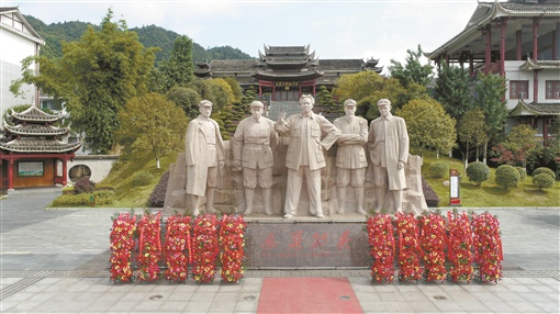 3月初,来到怀化市通道侗族自治县罗蒙山下的通道转兵纪念馆,广场上一座群雕格外吸引游客视线。只见位于正中的毛泽东手指前方,意气风发,朱德、周恩来、王稼祥、张闻天神色凝重,五人群雕栩栩如生,似在向来者讲述当年的故事。